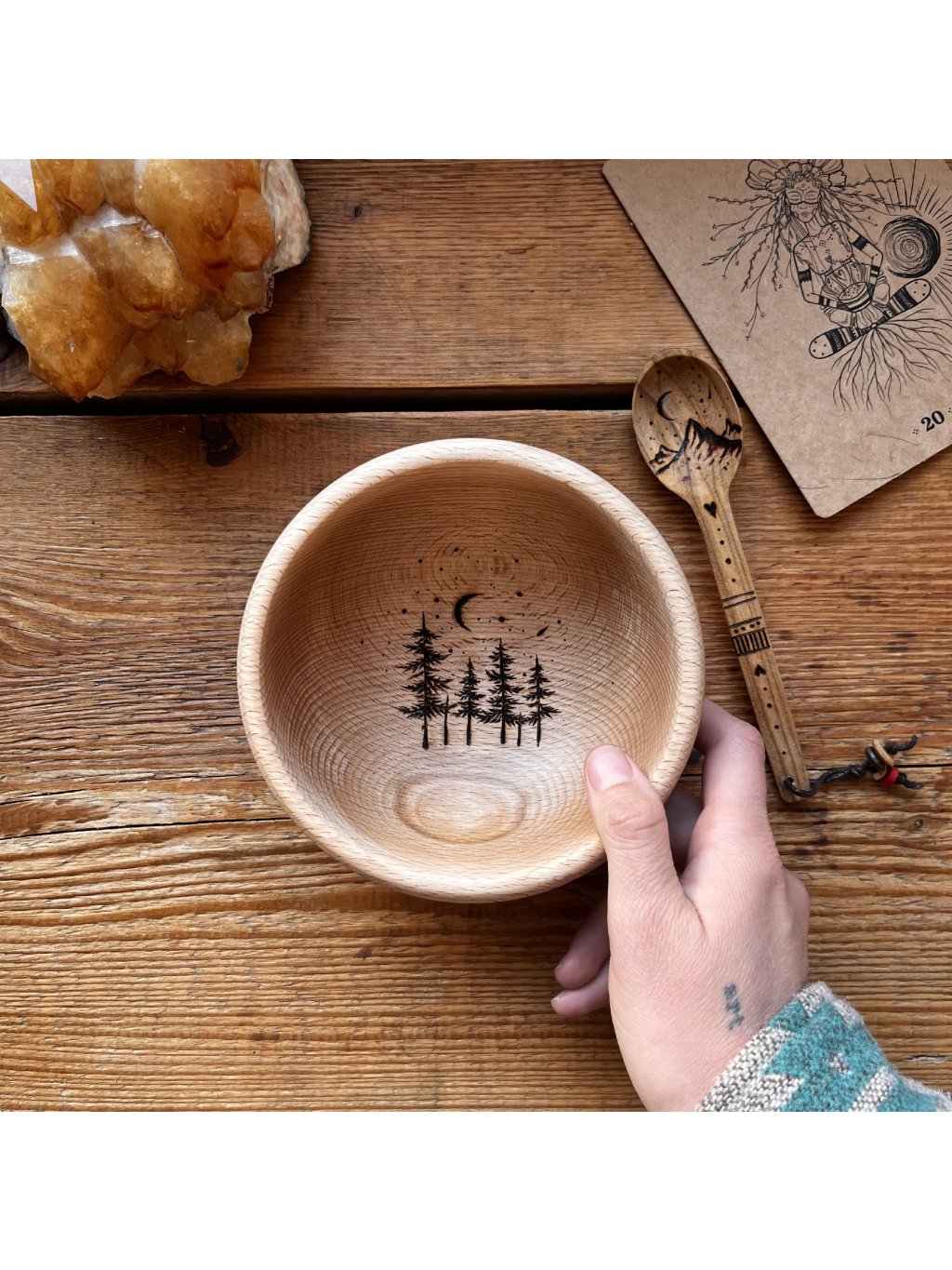 Sada bukové misky a třešňové lžičky nesoucí originální ručně vypalovaný motiv.
