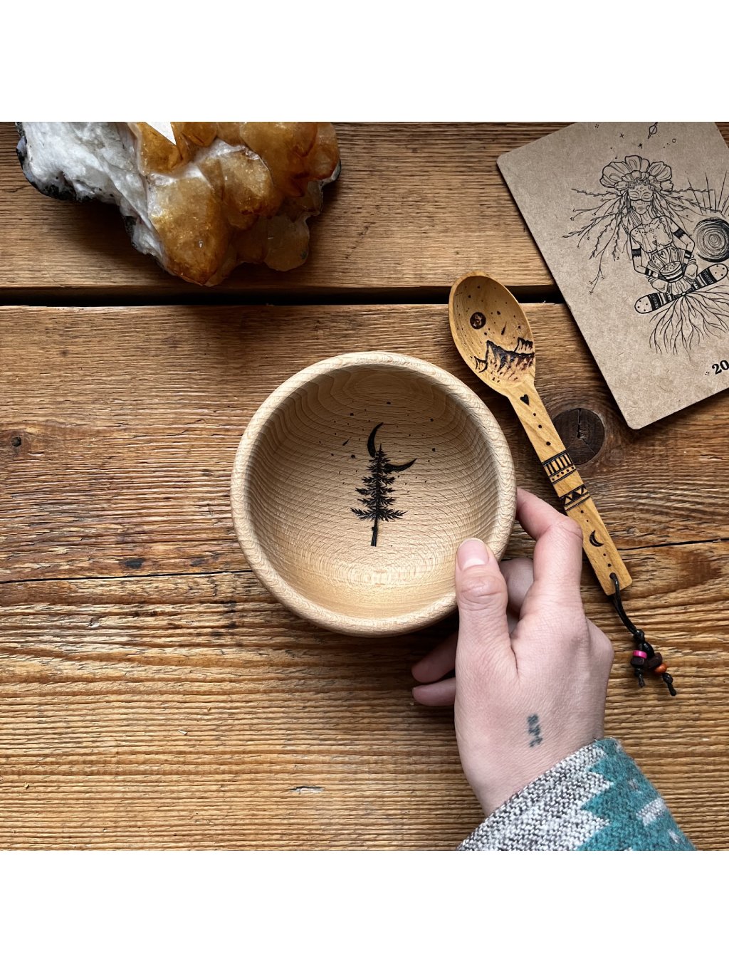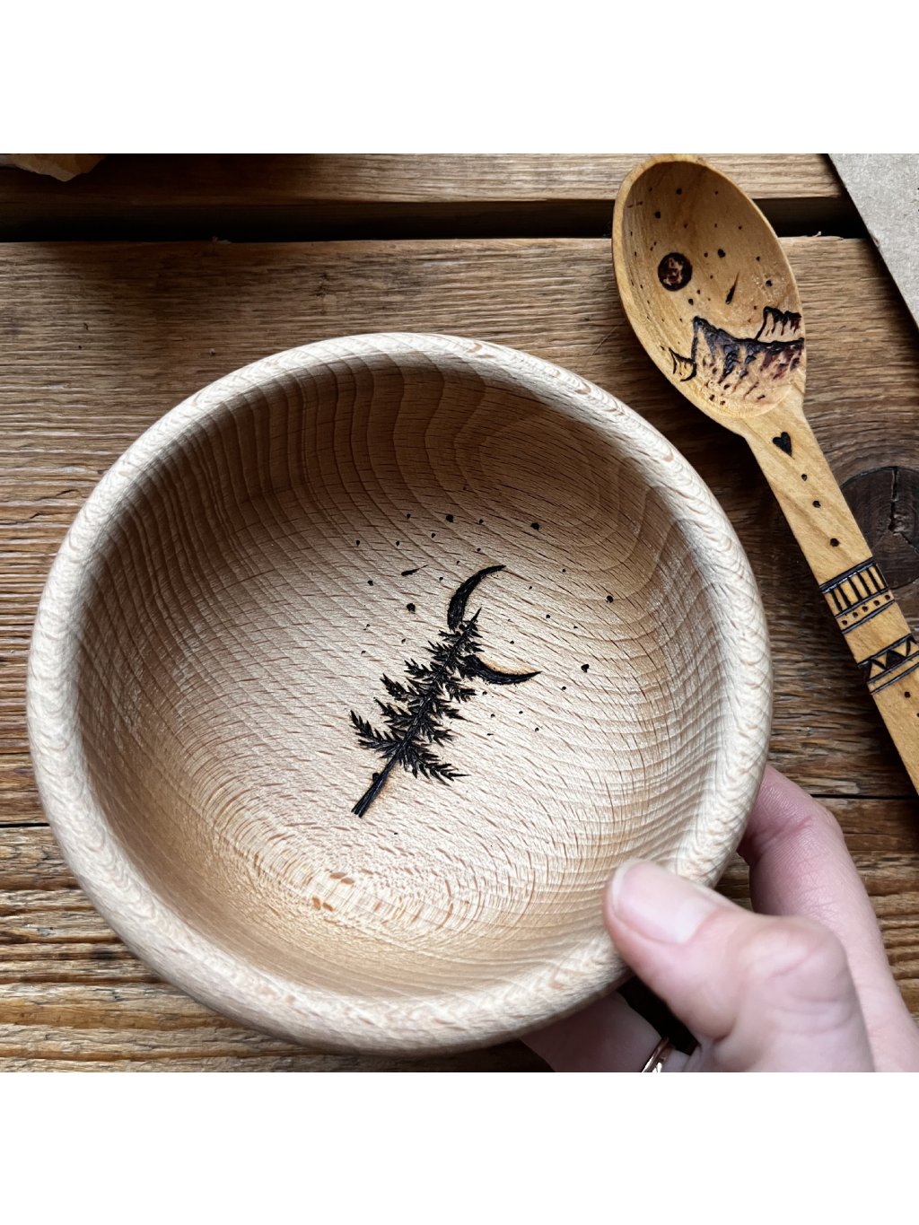 Sada bukové misky a třešňové lžičky nesoucí originální ručně vypalovaný motiv.