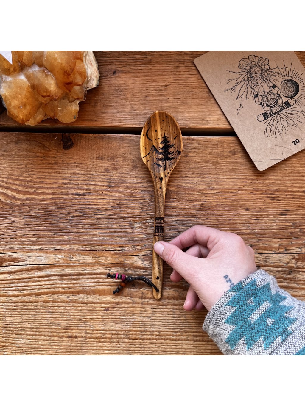 Lžíce z třešňového dřeva zdobena ručním vypalováním. Vyrobena pro pomalé snídaně v přírodě a teplou polévku u ohně. Nebo si díky ní můžete donést dobrodružnou atmosféru do tepla domova.
