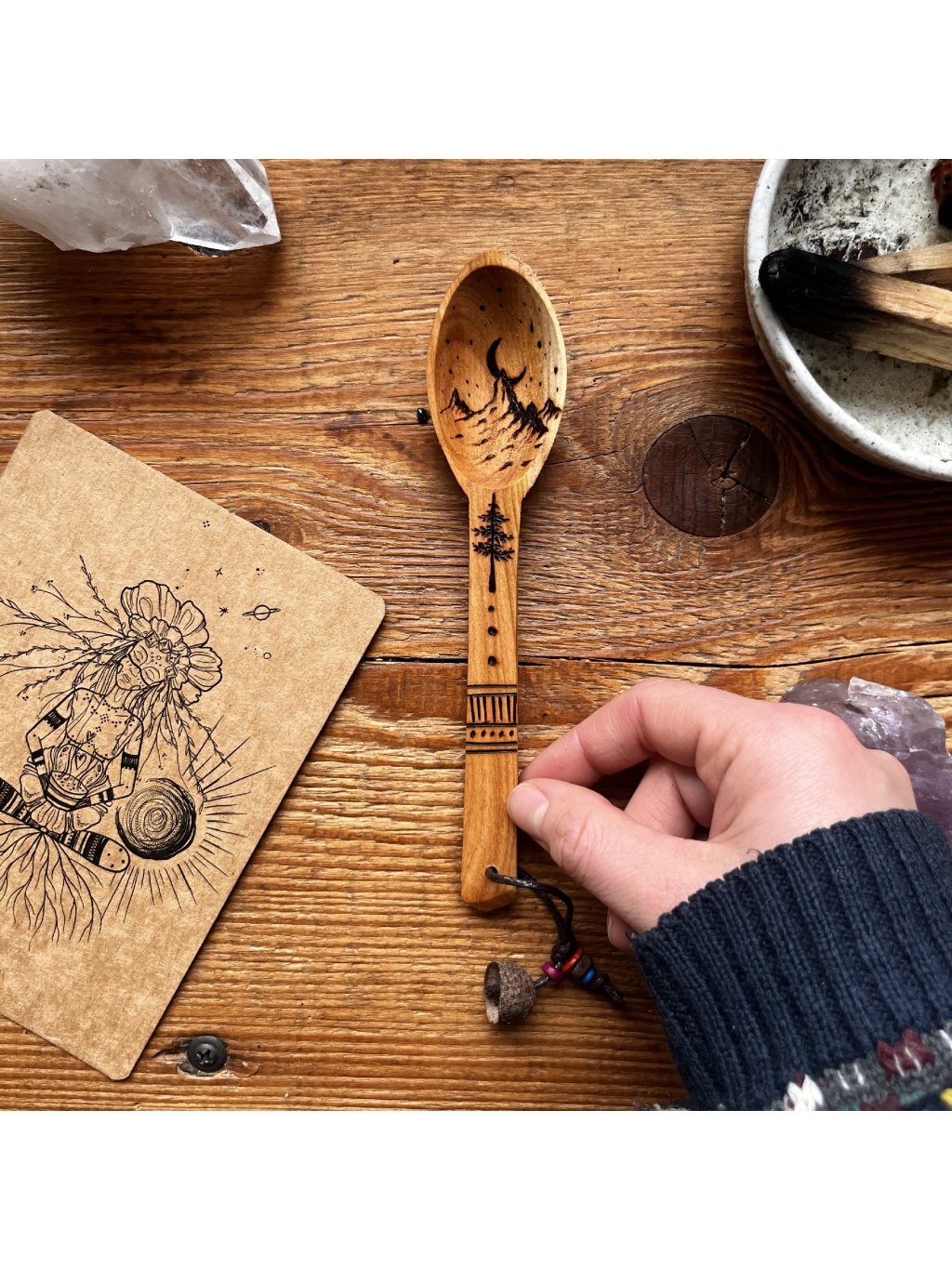 Lžička z třešňového dřeva zdobena ručním vypalováním. Vyrobena pro pomalé snídaně v přírodě a teplou polévku u ohně. Nebo si díky ní můžete donést dobrodružnou atmosféru do tepla domova.