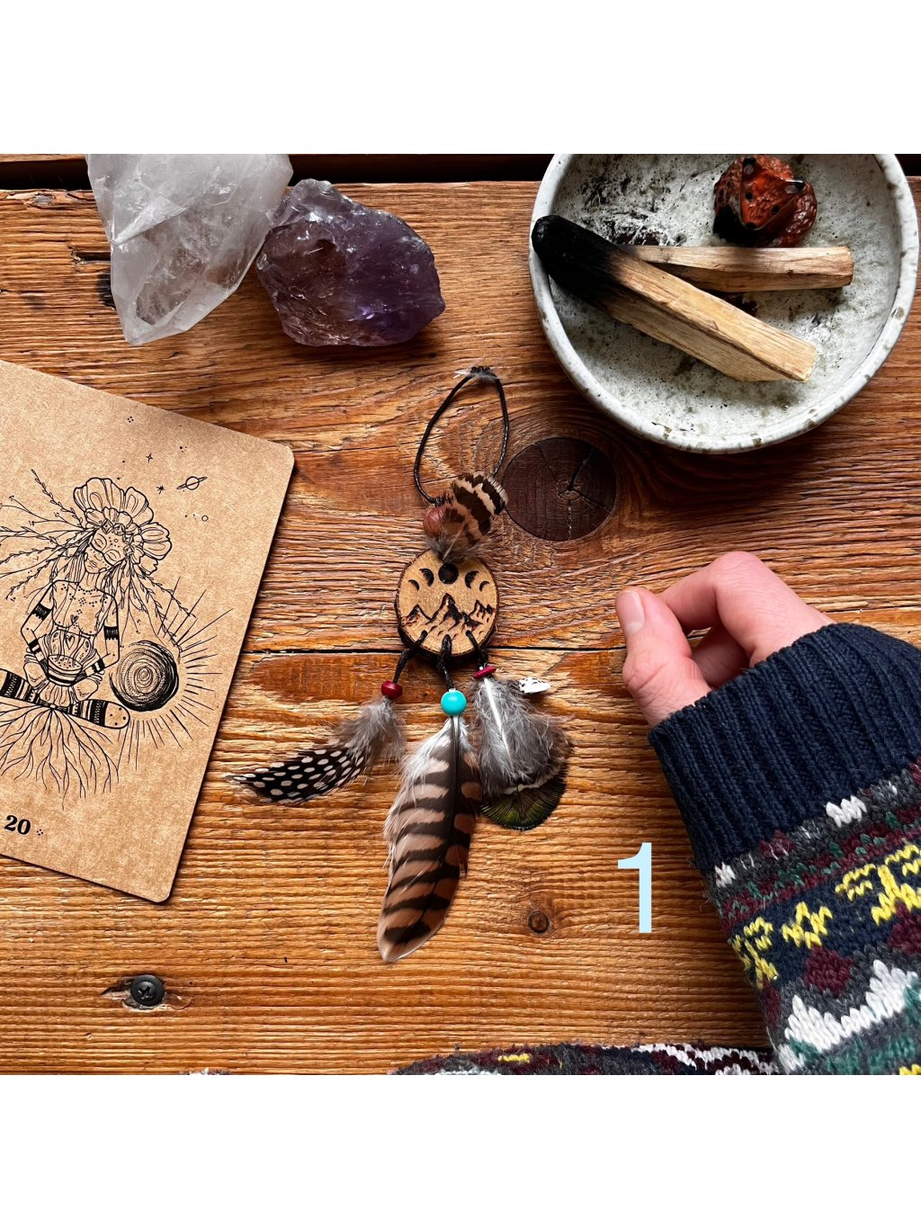 Vandráček nese energii Země 🌍 (dřevo, bukvice, žaludy, šišky…), vzduchu (pírka 🪶) , vody 🌊 (mušle ) a ohně 🔥 (ručně vypálený motiv).