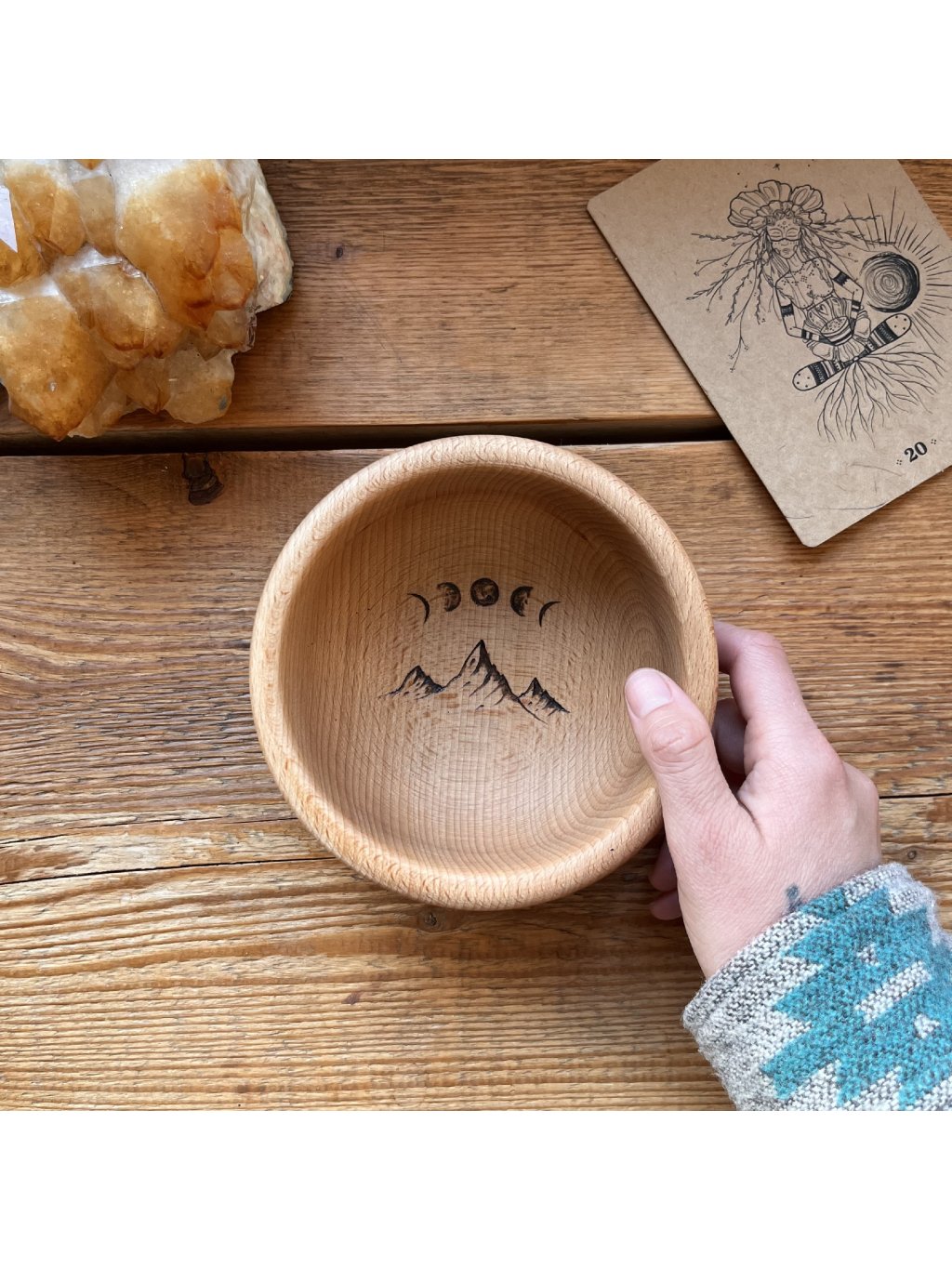 Buková miska nesoucí originální ručně vypalovaný motiv.