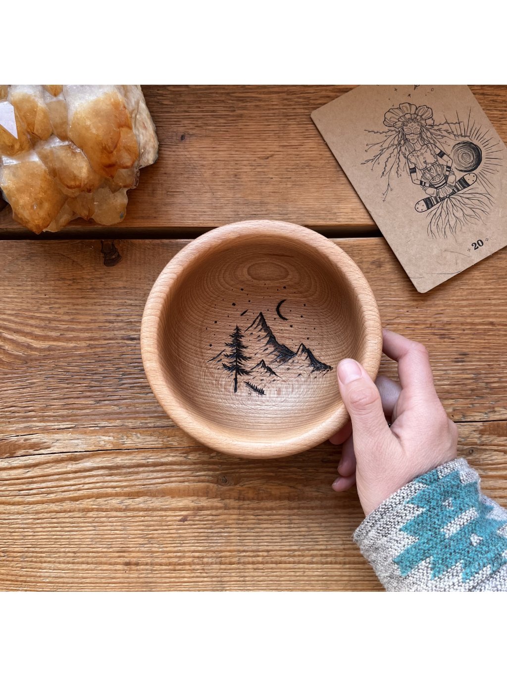 Buková miska nesoucí originální ručně vypalovaný motiv.