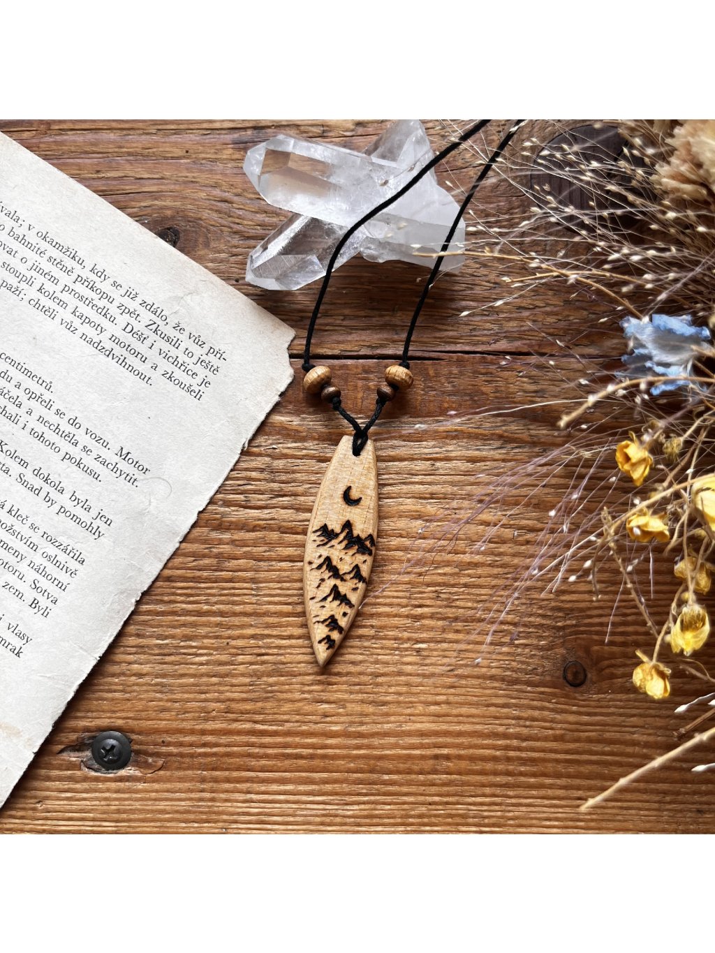 Zdoben ručně vypalovaným motivem, nese dřevěné korálky.