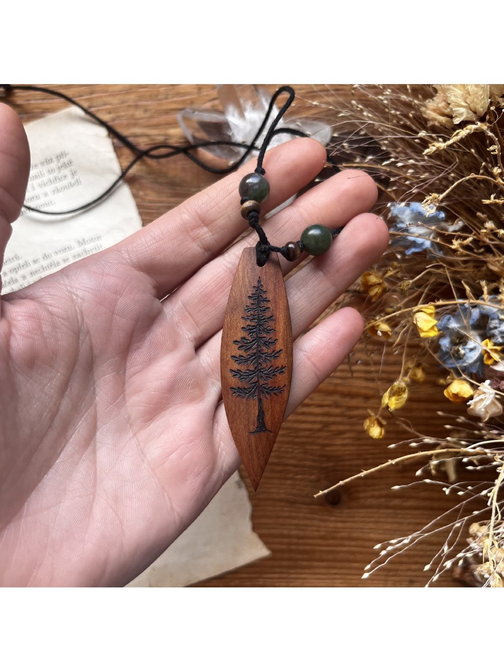 Zdoben ručně vypalovaným motivem stromu, nese kombinaci dřevěných a minerálních korálků z Nefritu.