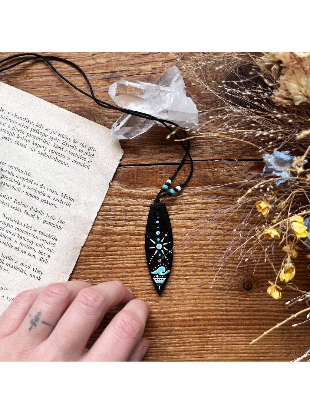 Surfík visí na bavlněné voskované šňůrce, která má posuvné uzlíky, abyste si mohli nastavit libovolnou velikost.