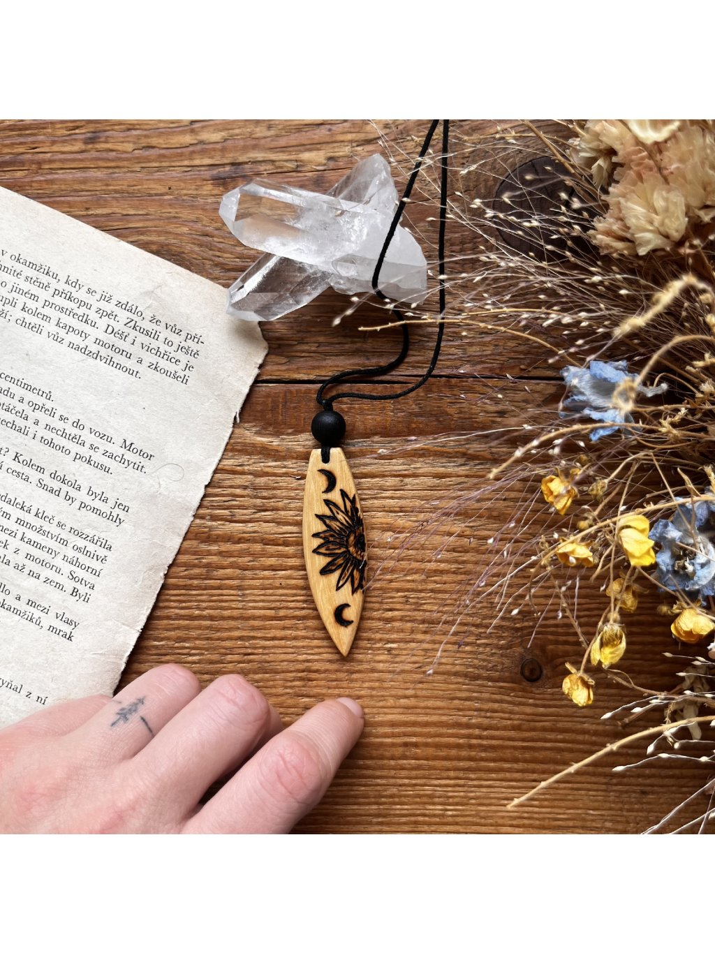 Zdoben ručně vypalovaným motivem slunečnice a nese dřevěný korálek.