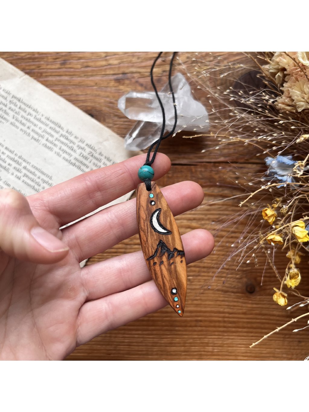 Surfík visí na bavlněné voskované šňůrce, která má posuvné uzlíky, abyste si mohli nastavit libovolnou velikost.