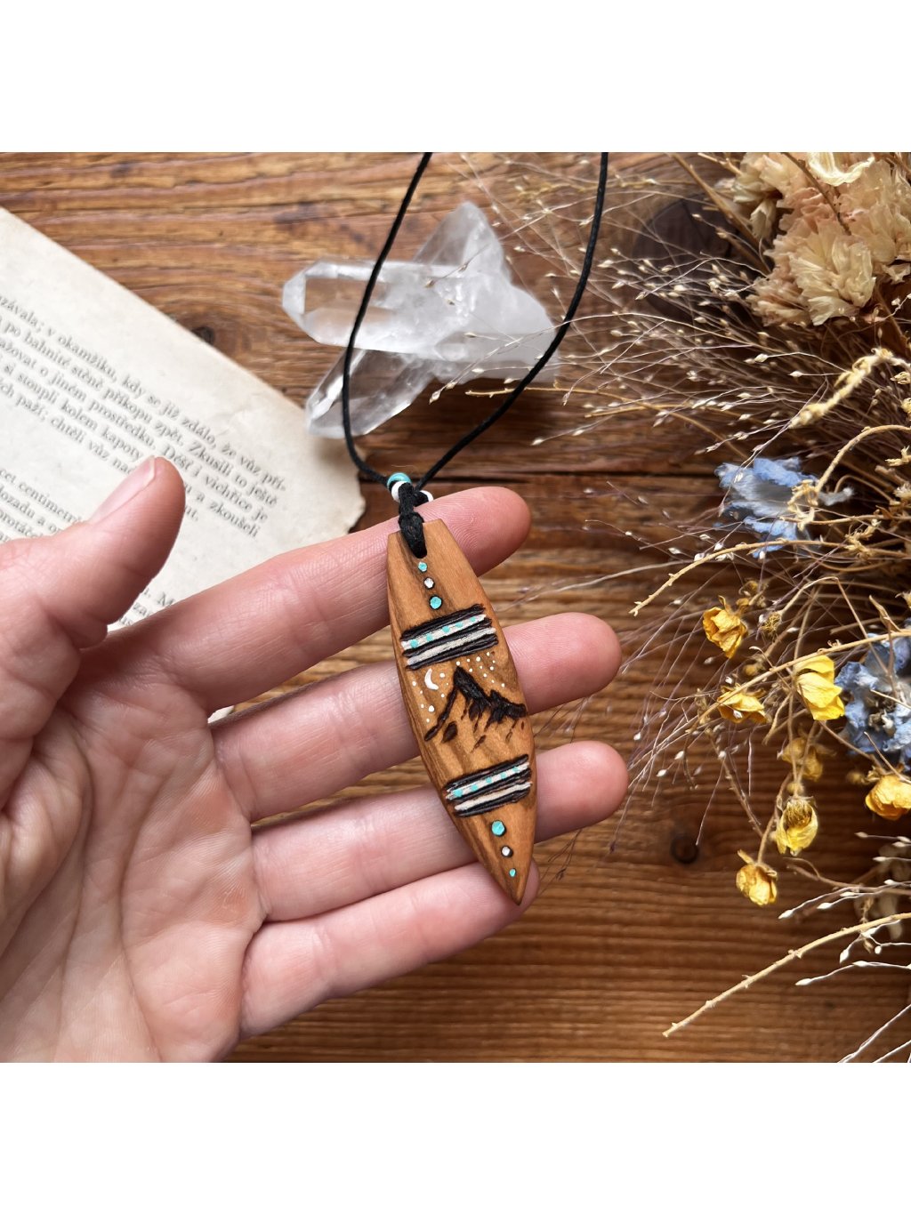 Surfík visí na bavlněné voskované šňůrce, která má posuvné uzlíky, abyste si mohli nastavit libovolnou velikost.