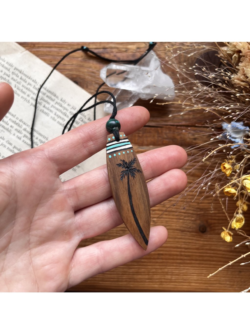 Surfík visí na bavlněné voskované šňůrce, která má posuvné uzlíky, abyste si mohli nastavit libovolnou velikost.
