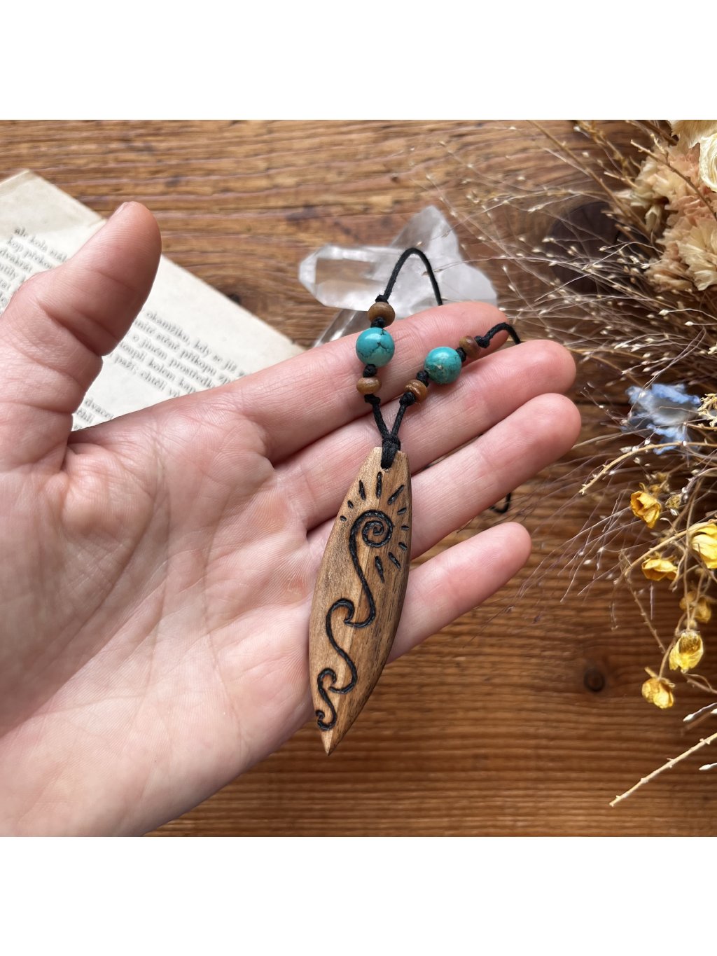 Nese ručně vypalovaný motiv a je dozdoben kombinací dřevěných a minerálních korálků z Howlitu.