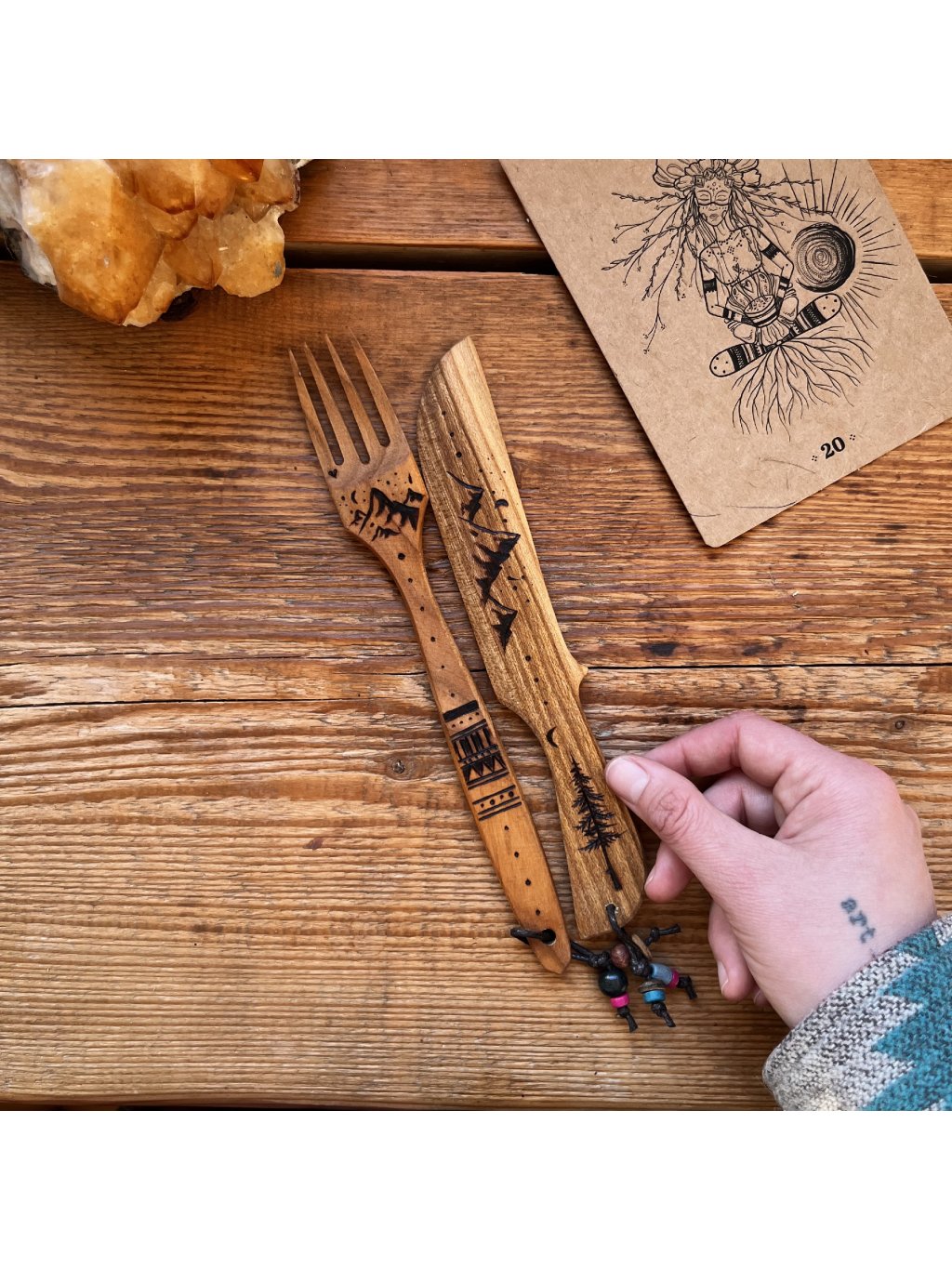 Zdivočelý příbor z třešňového dřeva, který je dozdoben ručně vypalovanými motivy.